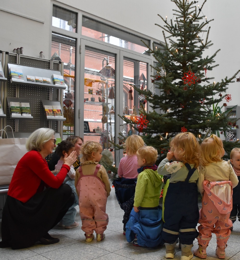 Parallel zum Gespräch der Tafelmitarbeitenden mit den Vertretern der Kreisverwaltung besuchte eine Gruppe des Forster Fröbel-Kindergartens das Kreishaus. Begrüßt von Dezernentin Fränze von Kuyck-Studzinski versahen die Kinder den im Foyer des Verwaltungsgebäudes aufgestellten Weihnachtsbaum mit ihrem selbstgebastelten Schmuck. Neben roten Papiersternen zieren nun ebenso kleine Rentiere aus Pappkarton den Baum. Als Dankeschön für ihren Einsatz erhielten die Kita-Kinder und ihre Erzieherinnen kleine Naschereien sowie gesundes Winterobst.