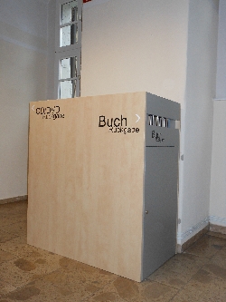 Die Rückgabebox ist ein Container, der zwei Einwurfklappen hat, eine für Bücher/Zeitschriften und eine für die so genannten Nonbook-Medien, also zum Beispiel CDs, Hörbücher und DVDs.