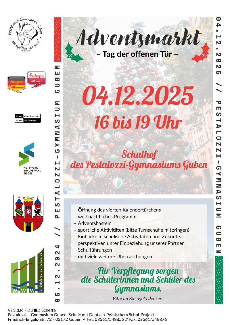 Adventsmarkt und Tag der offenen Tür am Gubener Pestalozzi-Gymnasium am 4. Dezember 2025