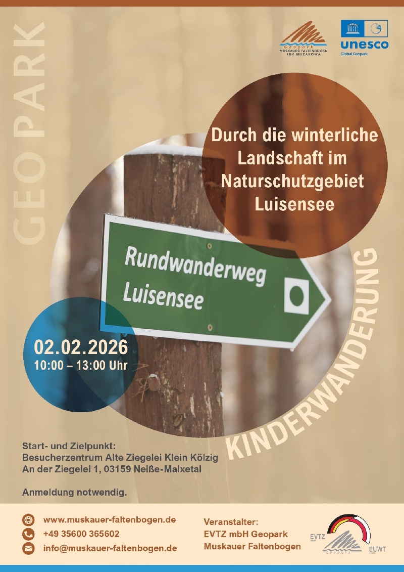 Die Kinderwanderung im UNESCO Global Geopark Muskauer Faltenbogen/Łuk Mużakowa findet am 2. Februar 2026 um 10:00 Uhr statt. Start- und Zielpunkt ist das Besucherzentrum in der Alten Ziegelei in Klein Kölzig.