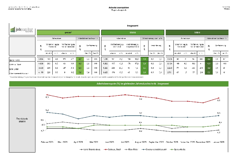 Rechtskreis SGB II: Im Zuständigkeitsbereich des Jobcenters Spree-Neiße sind aktuell 2.498 Personen arbeitslos gemeldet. Dies bedeutet ein leichtes Plus von 14 Personen im Vergleich zu Januar 2025. Die anteilige SGB II-Arbeitslosenquote liegt bei rund 4,4 Prozent.