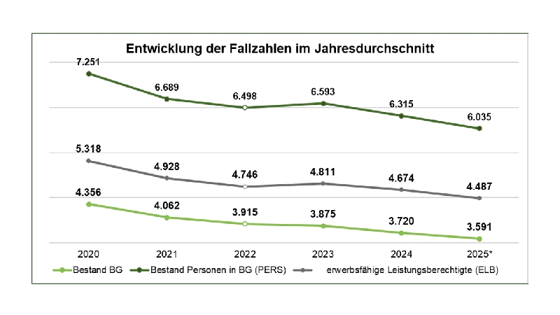 Trotz des Anstiegs der Arbeitslosigkeit ist die Zahl der Bedarfsgemeinschaften rückläufig: Das Jobcenter betreut im Januar 2026 3.362 Bedarfsgemeinschaften, 316 weniger als ein Jahr zuvor. Auch die Zahl der erwerbsfähigen Leistungsberechtigten sinkt deutlich um 410 Personen auf insgesamt 4.190.