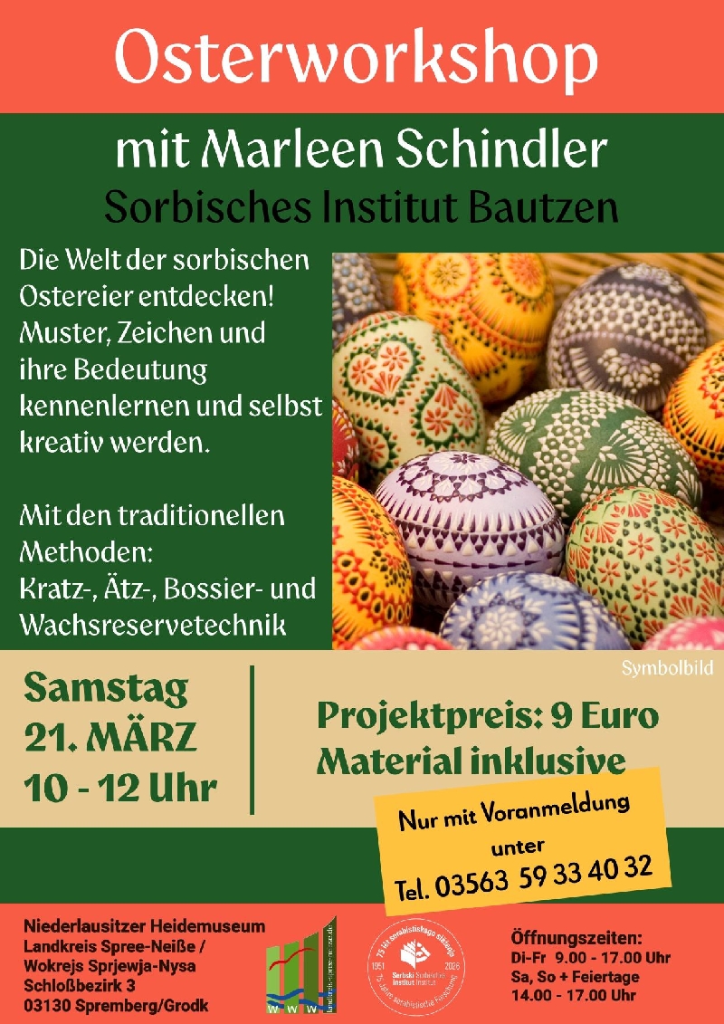 Am Samstag, dem 21. März 2026, lädt das Niederlausitzer Heidemuseum in Spremberg/Grodk in der Zeit von 10:00 bis 12:00 Uhr zu einem Workshop rund um das sorbische Osterei in den Festsaal des Museums ein. Die Einführung hält Marleen Schindler vom Sorbischen Institut Bautzen.